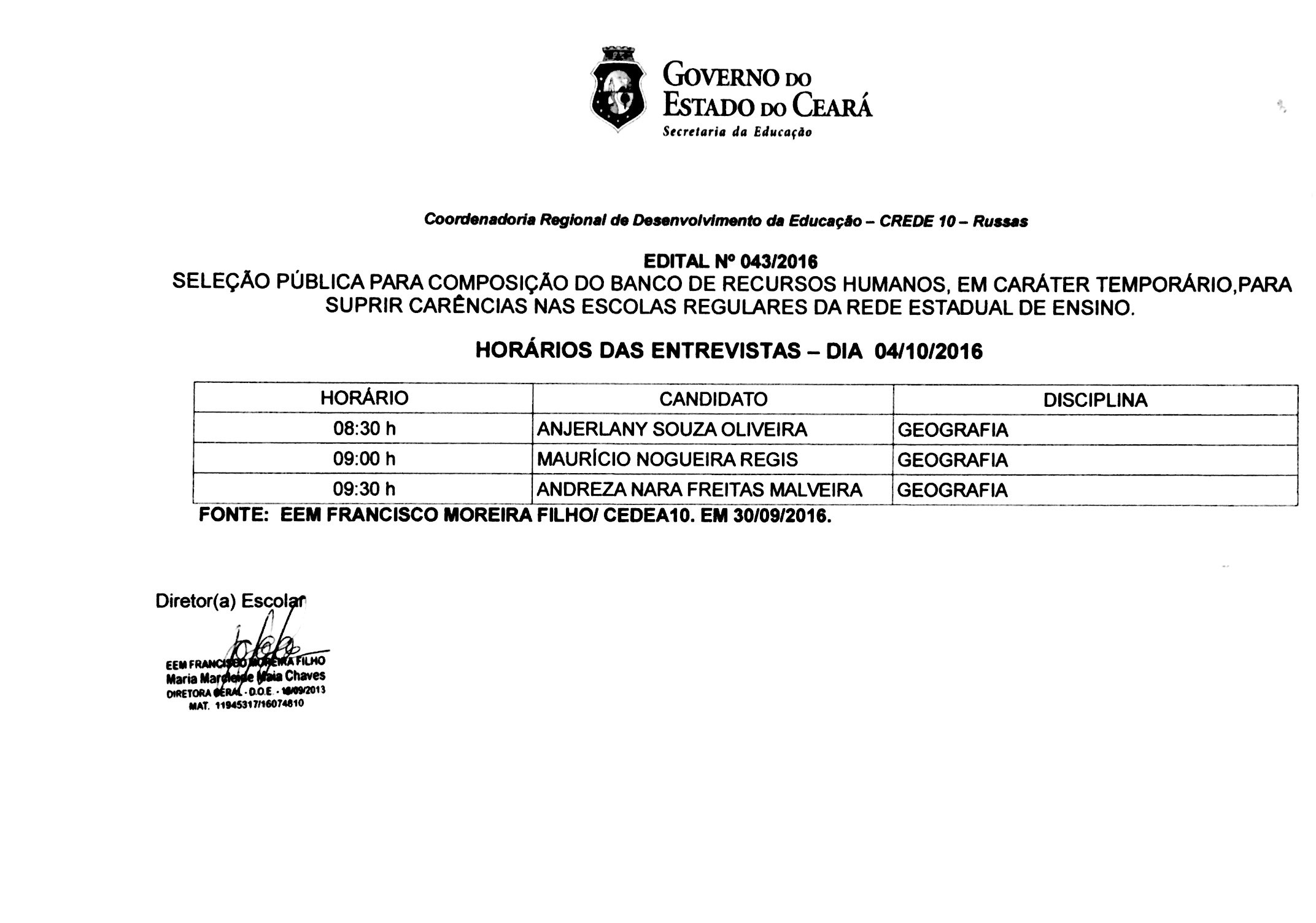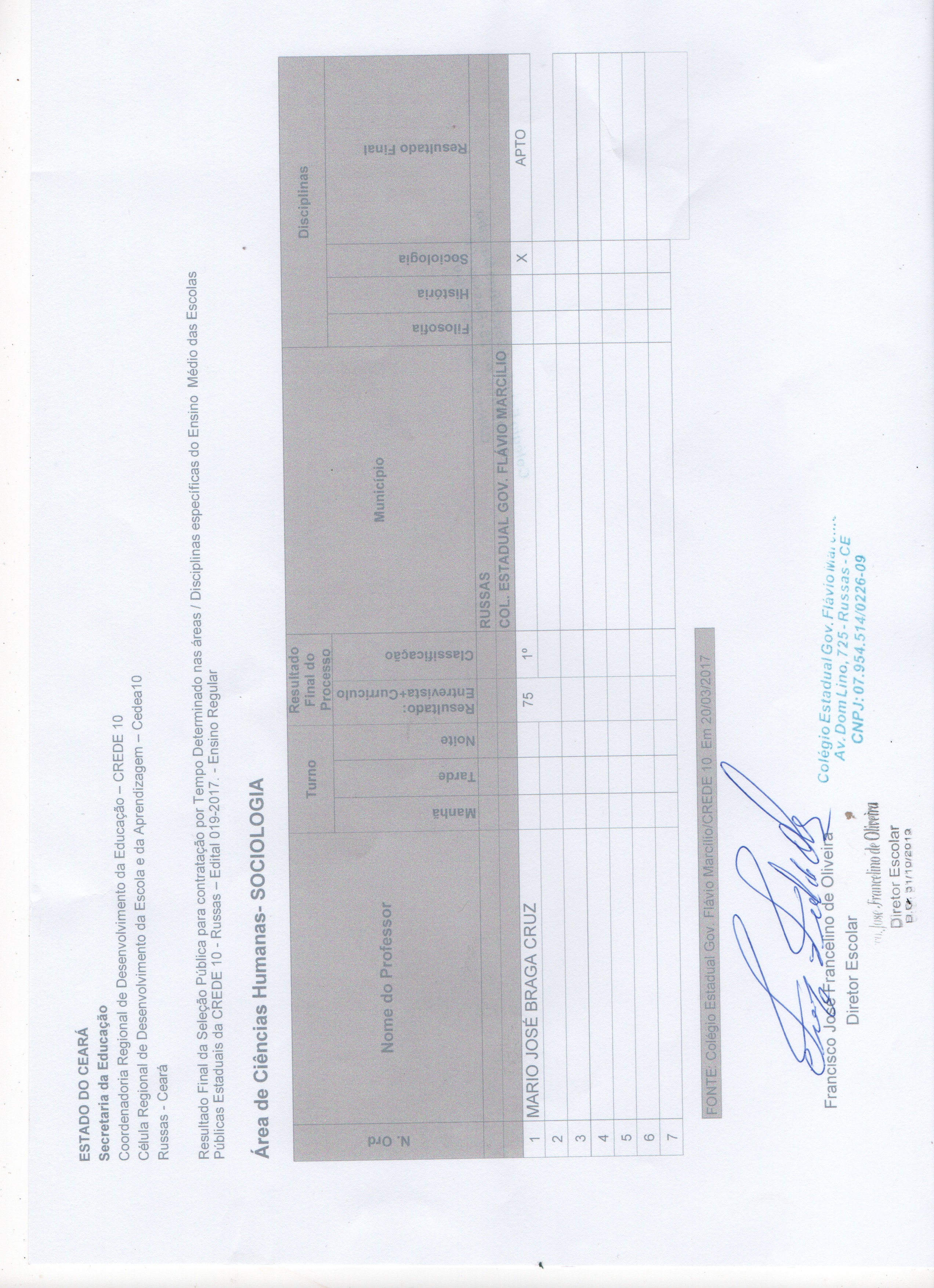 A Coordenadoria Regional de Desenvolvimento da Educação – CREDE 10 divulga o resultado final do processo seletivo referente ao edital 019/2016.