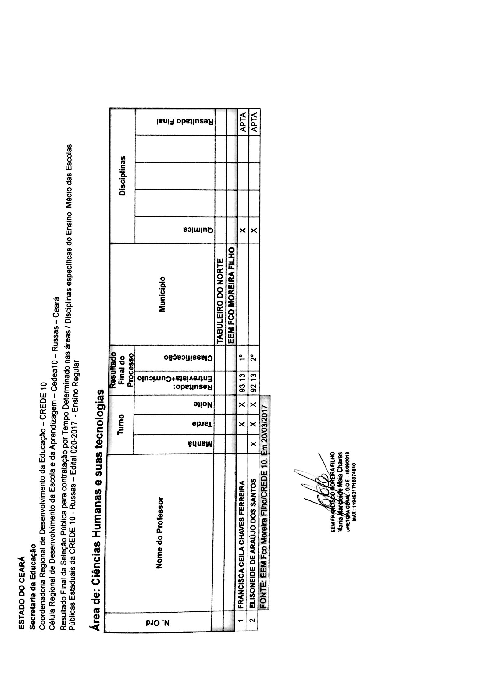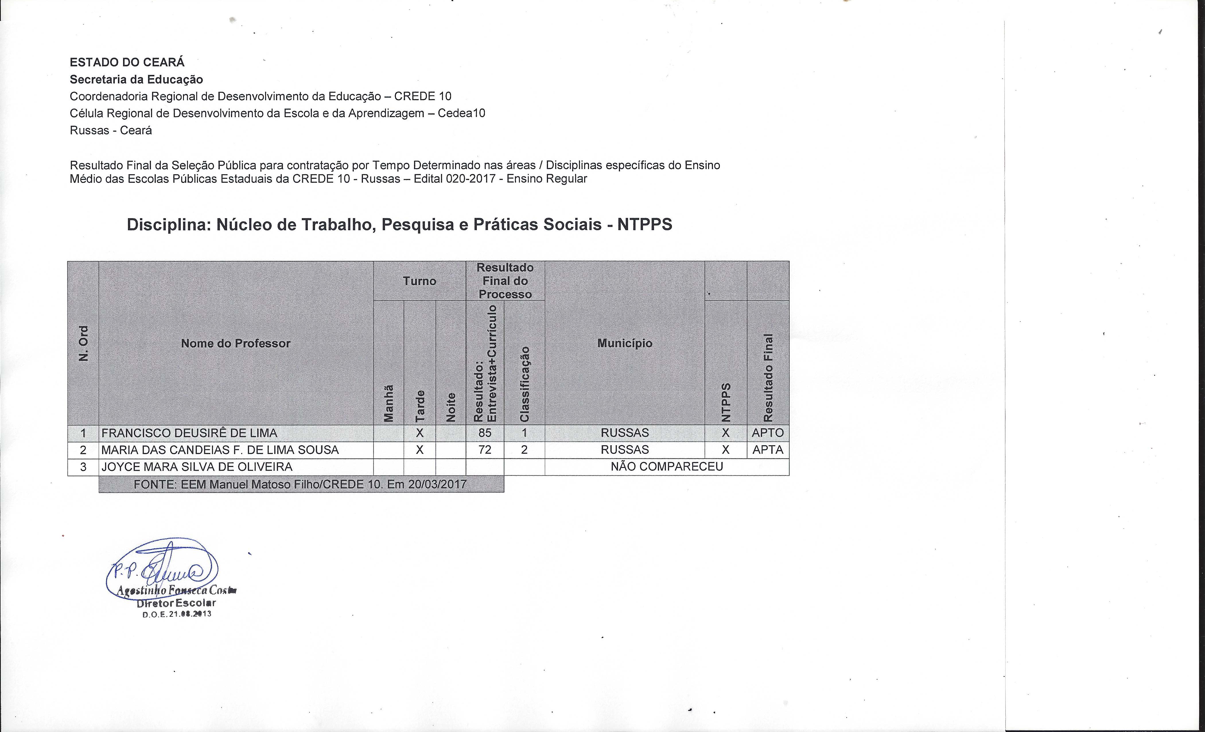 A Coordenadoria Regional de Desenvolvimento da Educação – CREDE 10 divulga o resultado final do processo seletivo referente ao edital 020/2016.