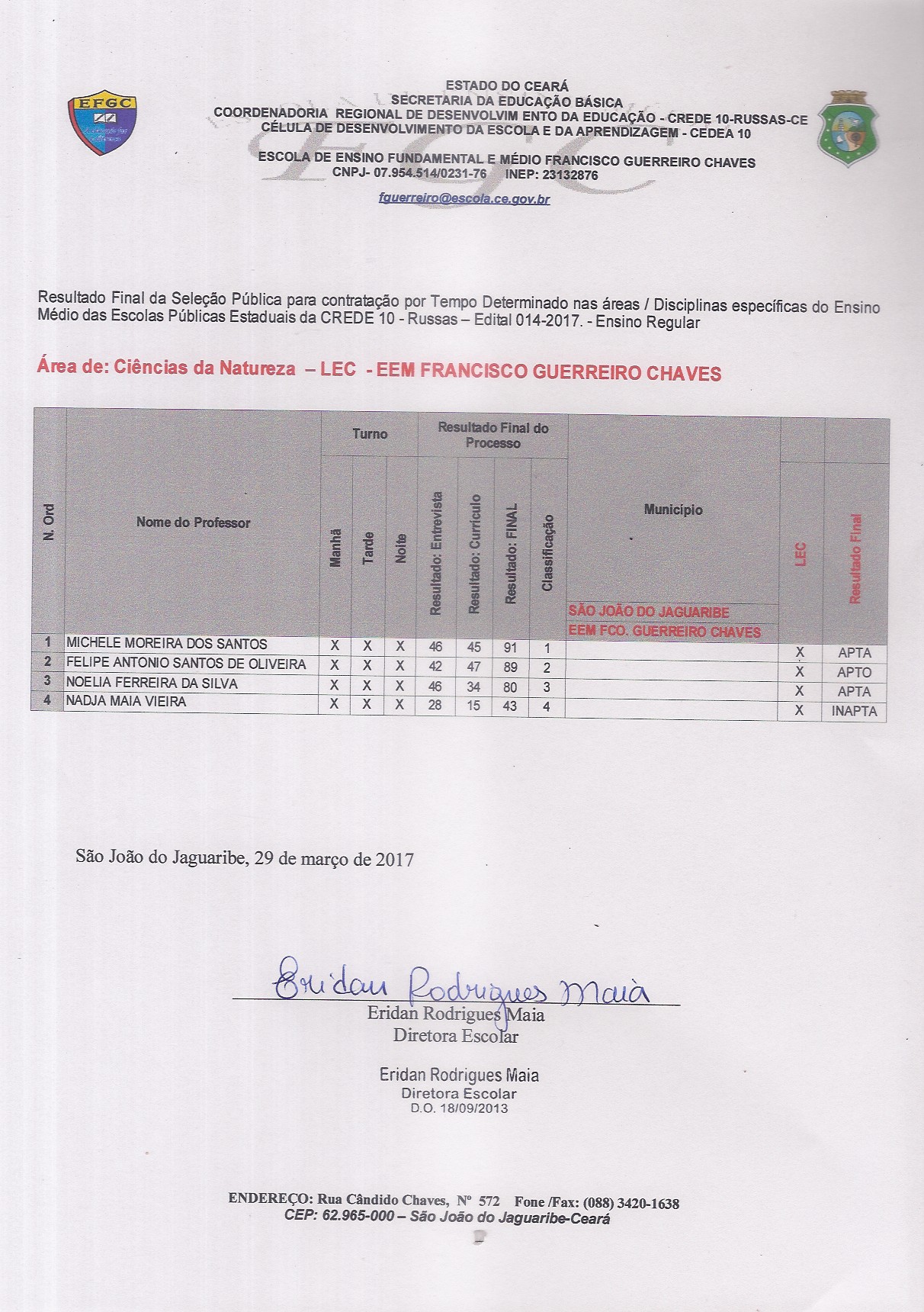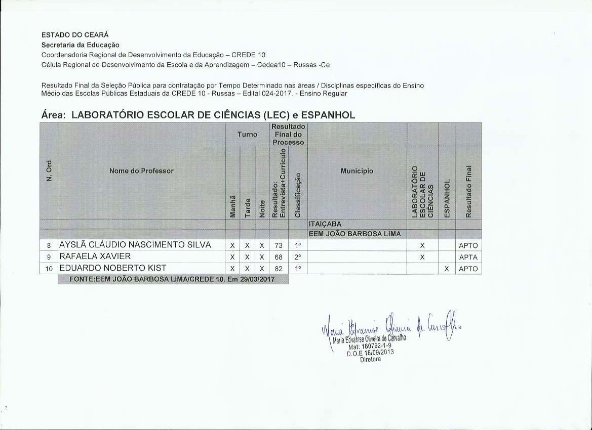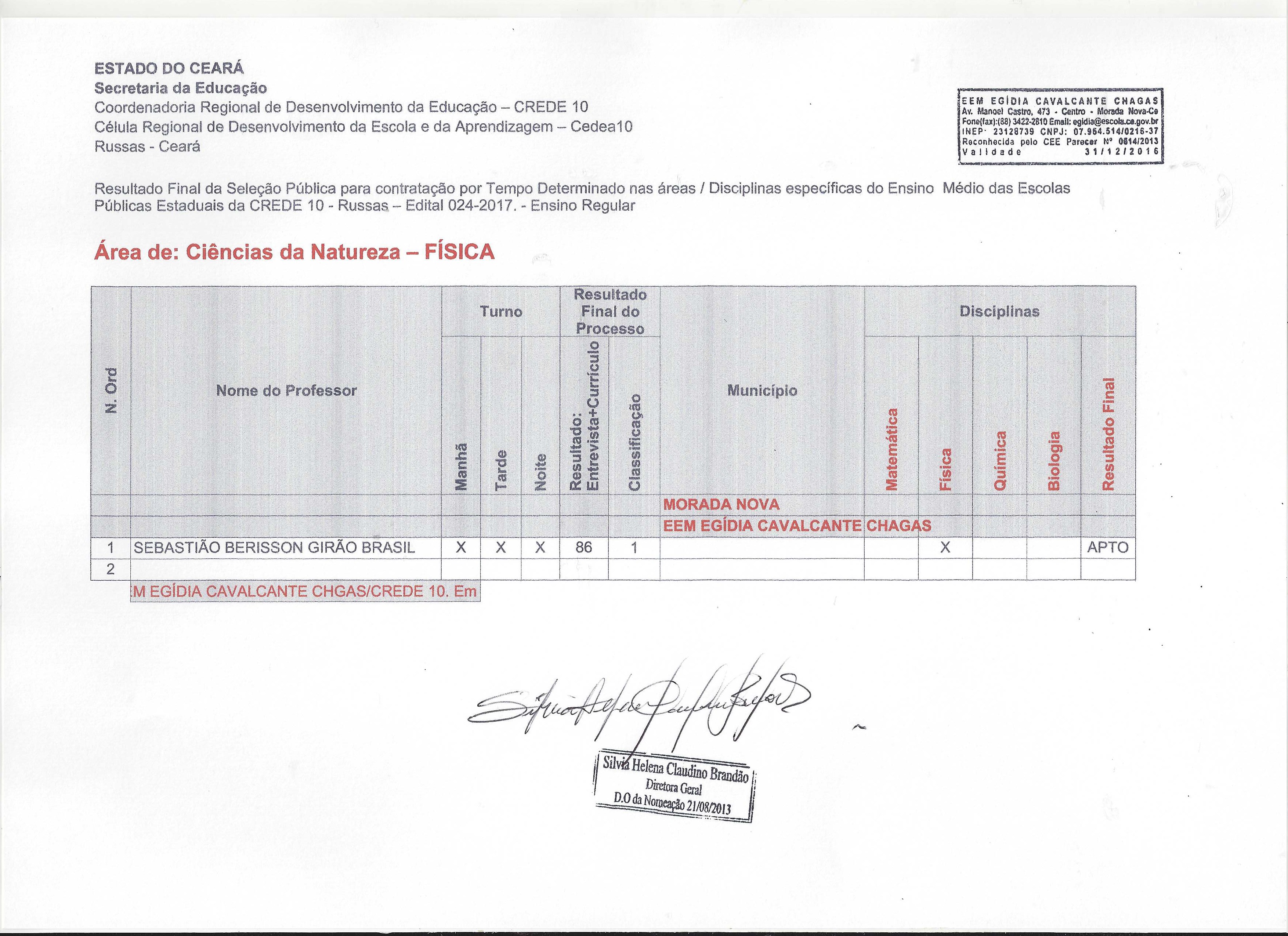 A Coordenadoria Regional de Desenvolvimento da Educação – CREDE 10 divulga o resultado final do processo seletivo referente ao edital 024/2017.