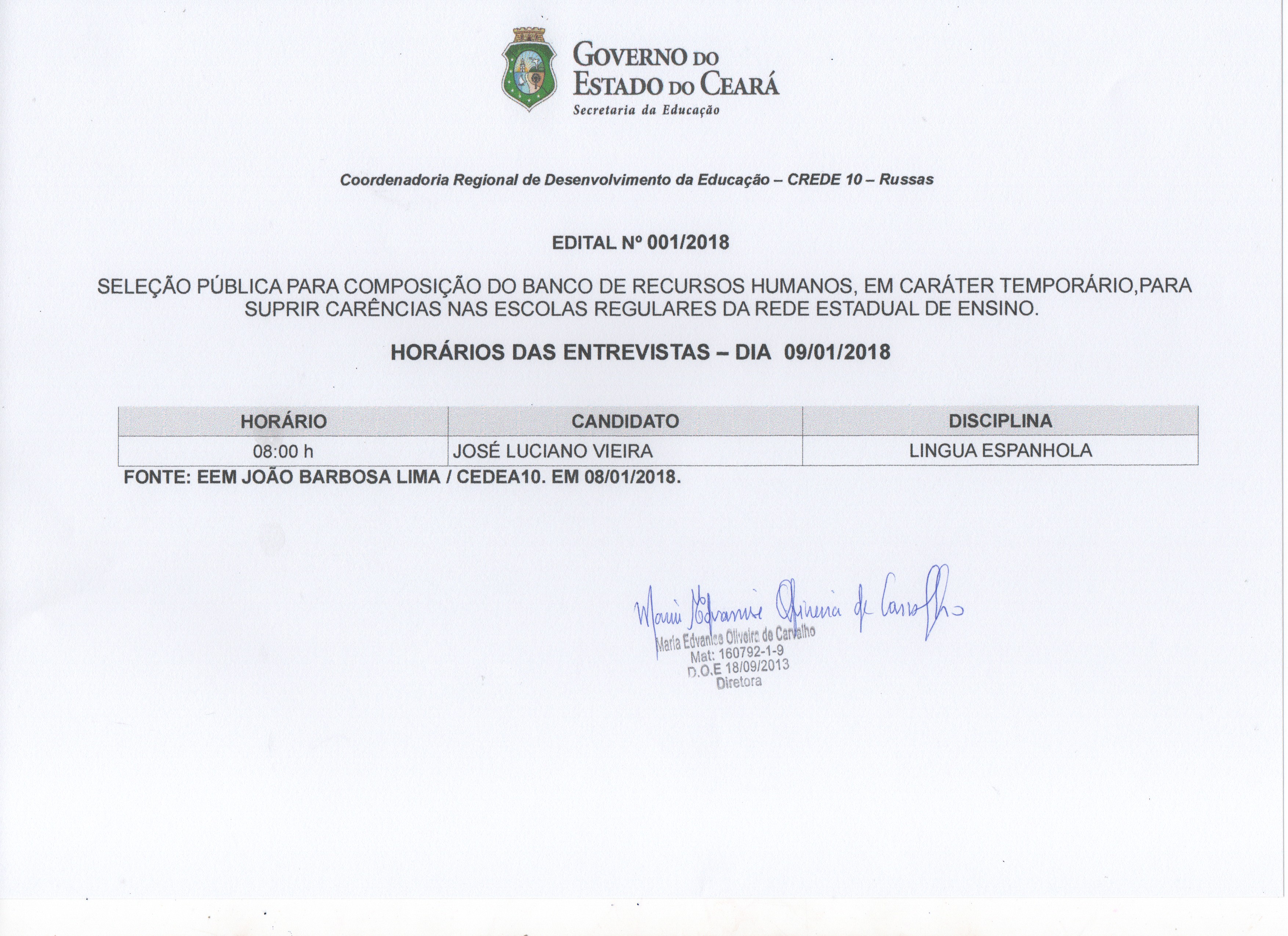 EEM João Barbosa Lima divulga as inscrições deferidas do edital 001/2018