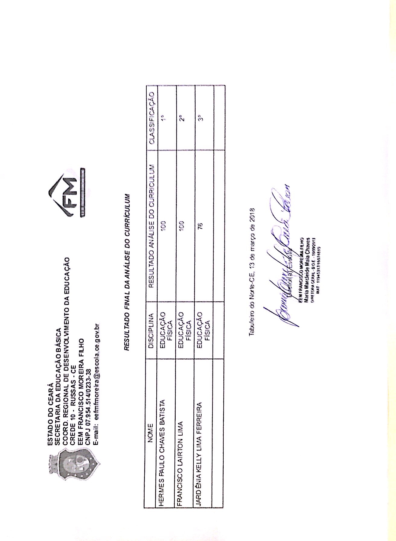 A diretora da EEM Francisco Moreira Filho, no uso de suas atribuições legais e atendendo ao que dispõe o Art. 4o, parágrafo 1º, da Lei Complementar Estadual Nº 22, de 24 de julho de 2000 e as alterações contidas na Lei Complementar Nº173, de 03 de agosto de 2017, divulga o resultado final do ed. 002/2018.