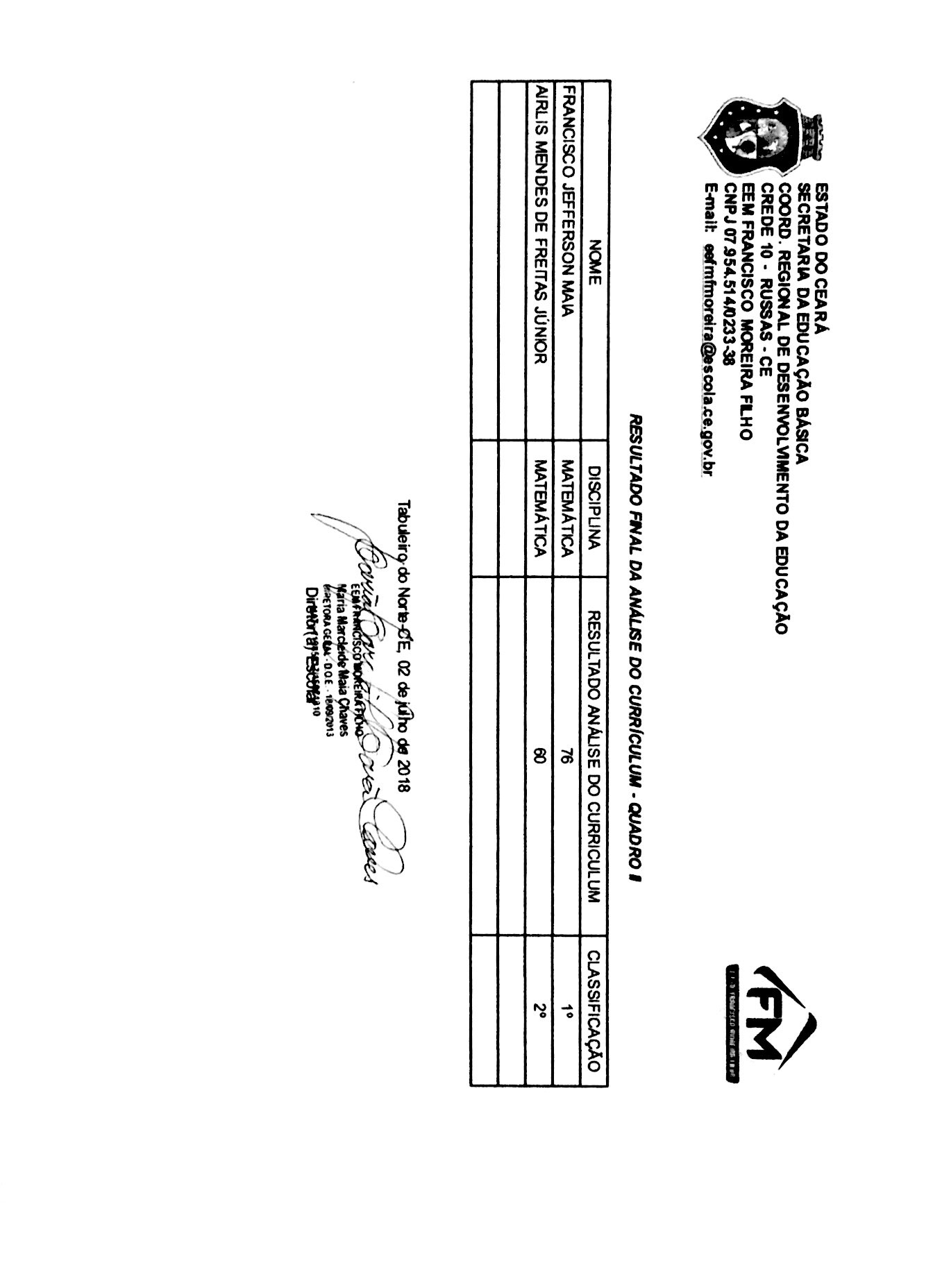A diretora da EEM Francisco Moreira Filho, no uso de suas atribuições legais e atendendo ao que dispõe o Art. 4o, parágrafo 1º, da Lei Complementar Estadual Nº 22, de 24 de julho de 2000 e as alterações contidas na Lei Complementar Nº173, de 03 de agosto de 2017, divulga o resultado final do Edital 005/2018.