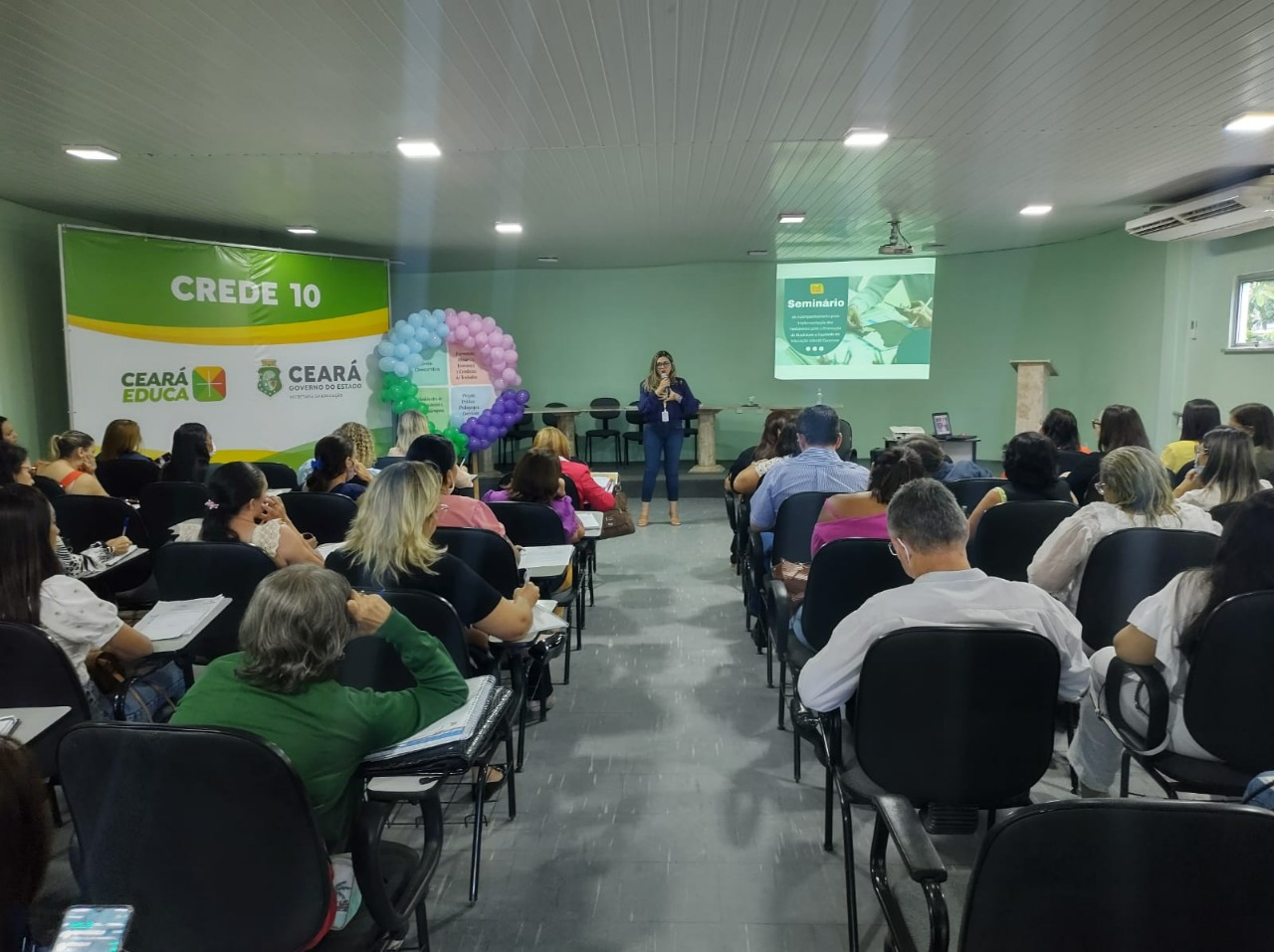 Na terça-feira, dia 17 de maio de 2022, a Coordenadoria de Educação e Promoção Social – COEPS/SEDUC, em parceria com a Célula de Cooperação com os Municípios – CECOM/CREDEs 10 e 11, realizou Seminário de acompanhamento da implementação dos Parâmetros para a Promoção da Qualidade e Equidade da Educação Infantil Cearense. O Evento contou com a participação da coordenadora da COEPS/SEDUC, Aparecida Prado, das gerentes da Célula de Apoio e Desenvolvimento da Educação Infantil – CADIN/COEPS/SEDUC, Wanda Peres e Érica Laurentino, da Coordenadora da CREDE 10, Emília Gomes, além das orientadoras, gerentes e articuladoras Mais Infância das CREDEs 10 e 11.
