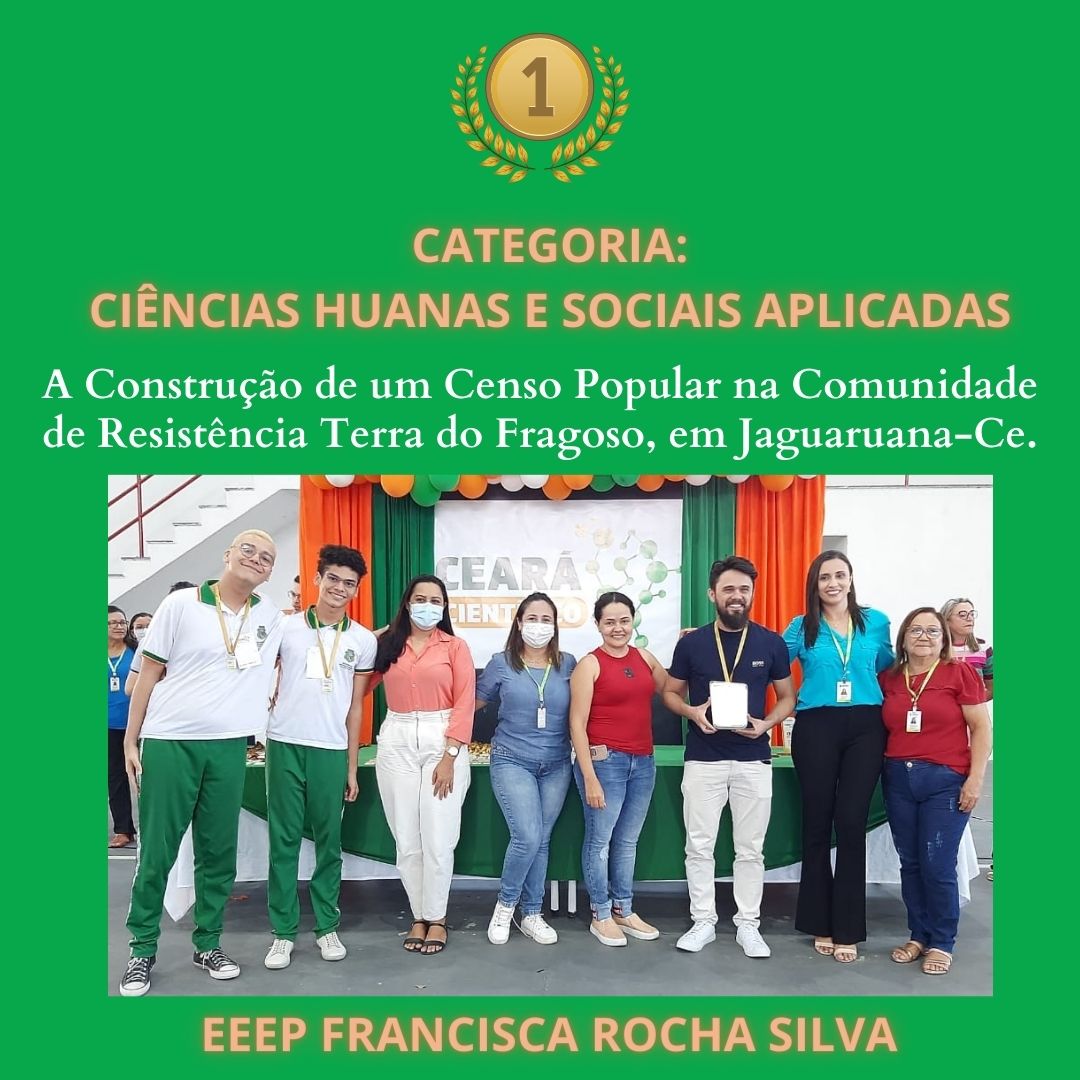 CLASSIFICAÇÃO – 1º – PROJETO – A CONSTRUÇÃO DE UM CENSO POPULAR NA COMUNIDADE DE RESISTÊNCIA NA TERRA DOM FRAGOSO, EM JAGUARUANA-CE. – ESCOLA – EEEP FRANCISCA ROCHA SILVA