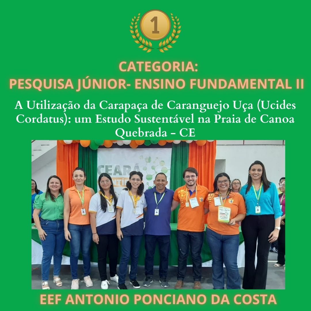 CLASSIFICAÇÃO – 1º – PROJETO – A UTILIZAÇÃO DA CARAPAÇA DE CARANGUEJO UÇÁ (UCIDES CORDATUS): UM ESTUDO SUSTENTÁVEL NA PRAIA DE CANOA QUEBRADA – CE – ESCOLA – EEF ANTONIO PONCIANO DA COSTA (ARACATI)