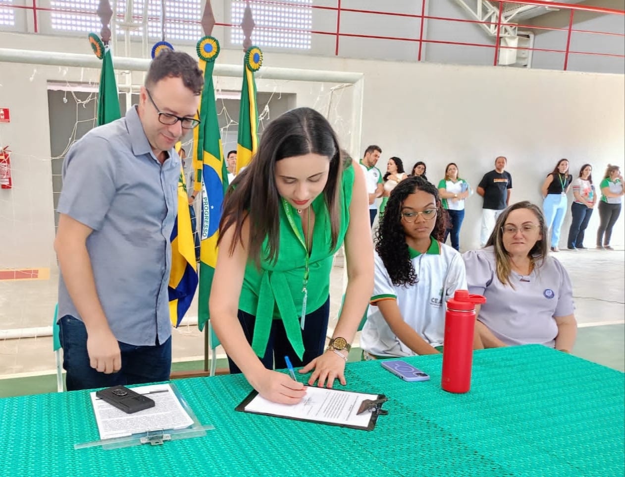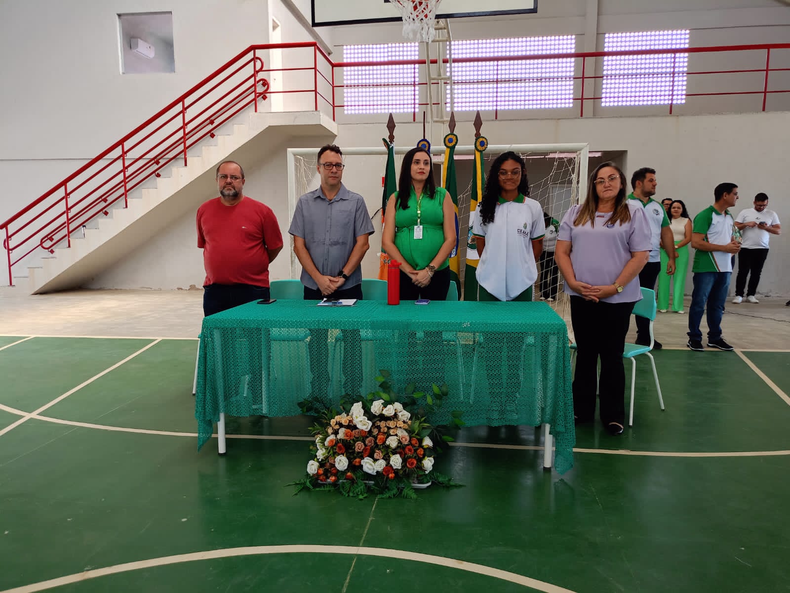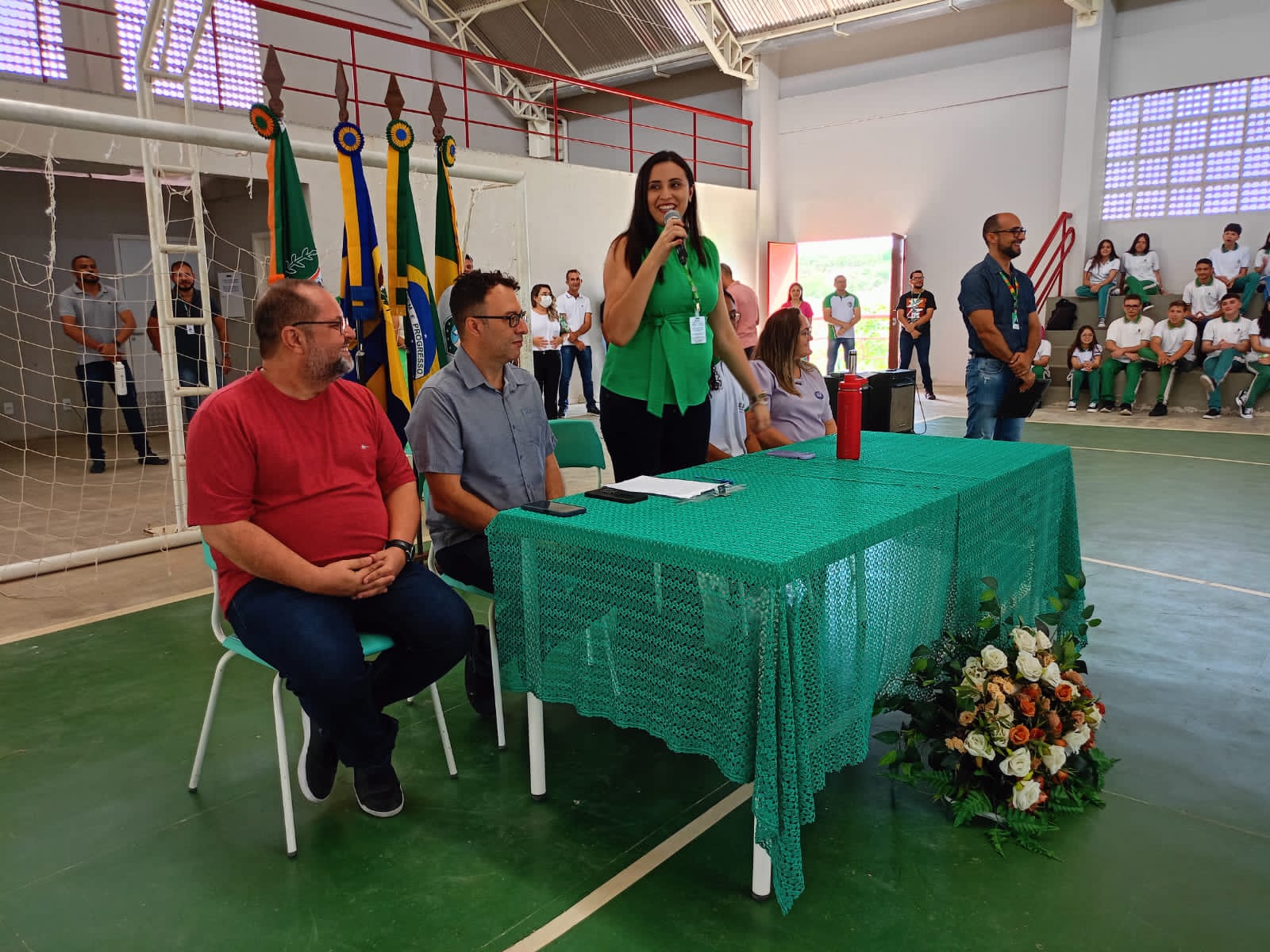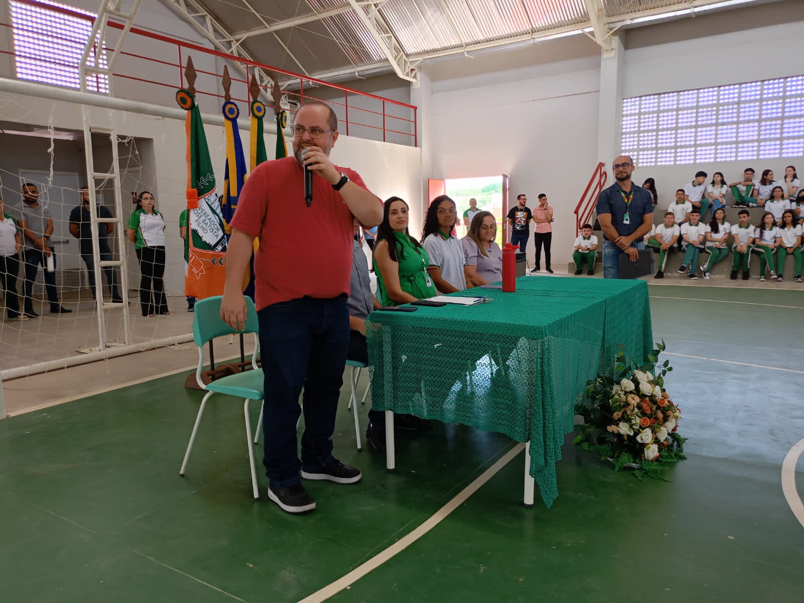Apresentação do novo Diretor da EEEP Vereador José Batista Filho, professor Cristiano Silva da Rocha Diógenes à comunidade escolar, realizada pela coordenadora da Crede 10, Emília Gomes Celedônio no primeiro dia letivo de 2024.